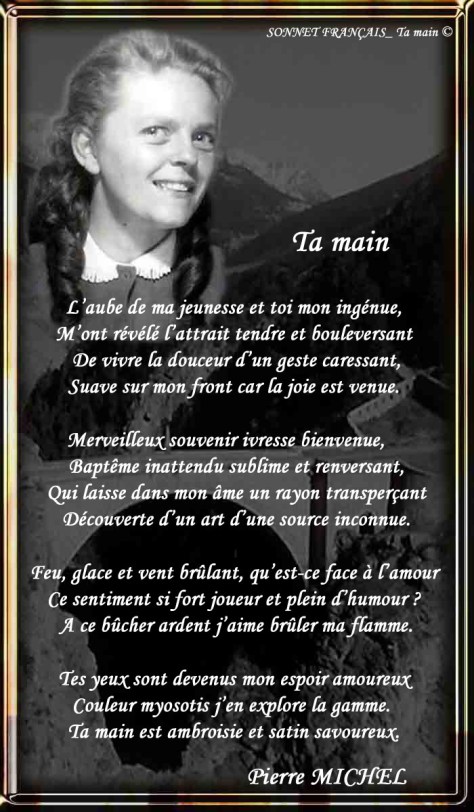 Tes yeux sont devenus mon espoir amoureux Couleur myosotis j’en explore la gamme. Ta main est ambroisie et satin savoureux.